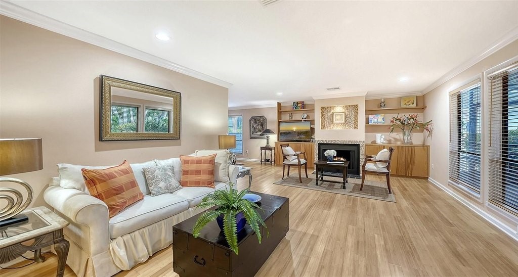 Welcome to Siesta Cove on Siesta Key, just minutes from world famous Siesta Key Beach. This bright, well maintained home offers comfortable island living in one of the area's most desirable neighborhoods. The layout provides excellent flexibility with both a living room and a separate family room, giving you plenty of space to relax or entertain guests. Oversized windows throughout the home bring in natural light and offer beautiful views of the mature tropical landscaping, creating an inviting atmosphere. Built in cabinetry and shelving add character to the living room, while the two skylights in the family room bring in beautiful natural light throughout the day. The kitchen offers granite countertops, a large island with seating, and generous cabinet storage. The cabinets are real maple with soft close drawers and doors, crown molding, and lighted glass display cabinets. Additional conveniences include under cabinet lighting and pull out drawers, making storage easy and accessible. The primary suite serves as a comfortable private retreat. It features a large walk in closet with built in organization and an en-suite bathroom with dual vanities, granite countertops, and a spacious tiled shower. After spending the day at Siesta Key Beach, you can rinse off at the outdoor shower before heading inside. Two outdoor living areas allow you to enjoy Florida's coastal climate: a front entrance lanai and a private lanai off the family room, both ideal for morning coffee or relaxing in the evening. The side load two car garage enhances the home's curb appeal and provides additional storage space. Several major systems have already been updated. The roof was replaced in 2020, including two skylights. The home also features PVC sewer lines, the air conditioning system was replaced in 2022, and the water heater was replaced in 2023. Best of all, the property experienced no damage during the recent storms, providing additional peace of mind for buyers. This is a wonderful opportunity to enjoy the relaxed lifestyle of Siesta Key, just minutes from the beach, dining, and everything the island has to offer.